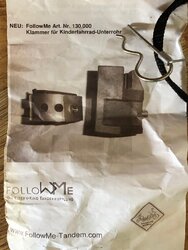 this is our FollowMe Tandem. It's approximately 10 years old and was not used in the last 8. I am finally getting it cleared from the garage. It's in a great condition except for the quick release skewer, which is rusty but working. Two sets of wheel mounts, M9 and 3/5'' and two steel belts (they go around downtube), one unused, the other used and cut to size. Page from the original manual (the Tandem was originally bought in Germany).